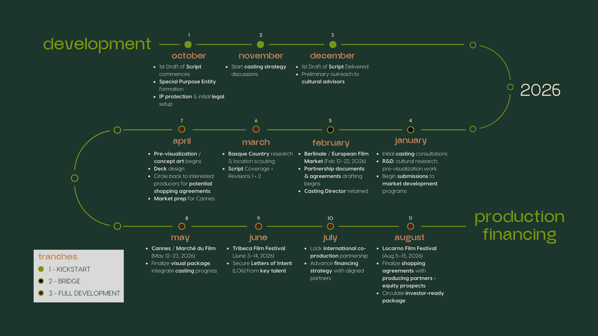 Of equal importance, fall deadlines for premier industry programs (e.g., Berlinale Talents, Cannes’ Cinéfondation, and Tribeca Works in Progress) are fast approaching. These programs are gateways to financiers and European co-production partners. Without funds in place by Q4 2025, we risk missing a full cycle of access and losing momentum at a critical moment.